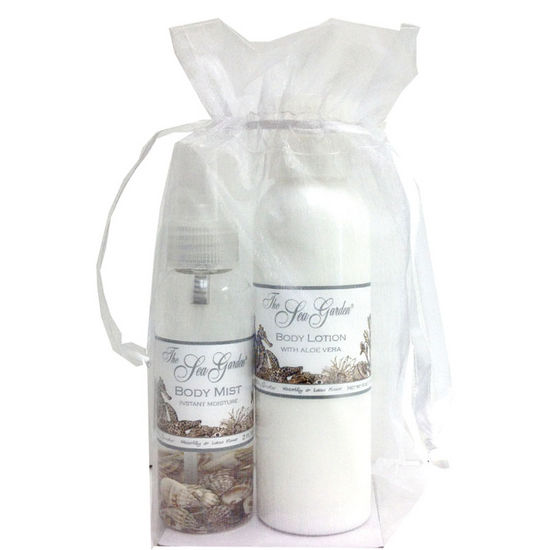 | This great set contains a 4 oz Body Lotion and a 2 oz Body Mist with sea shells. Packaged in a white chiffon bag. |